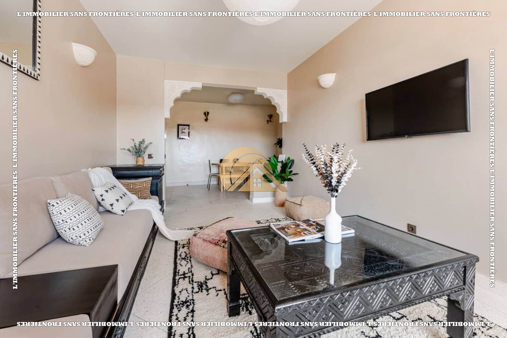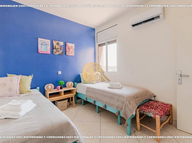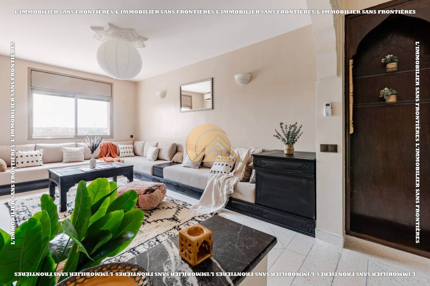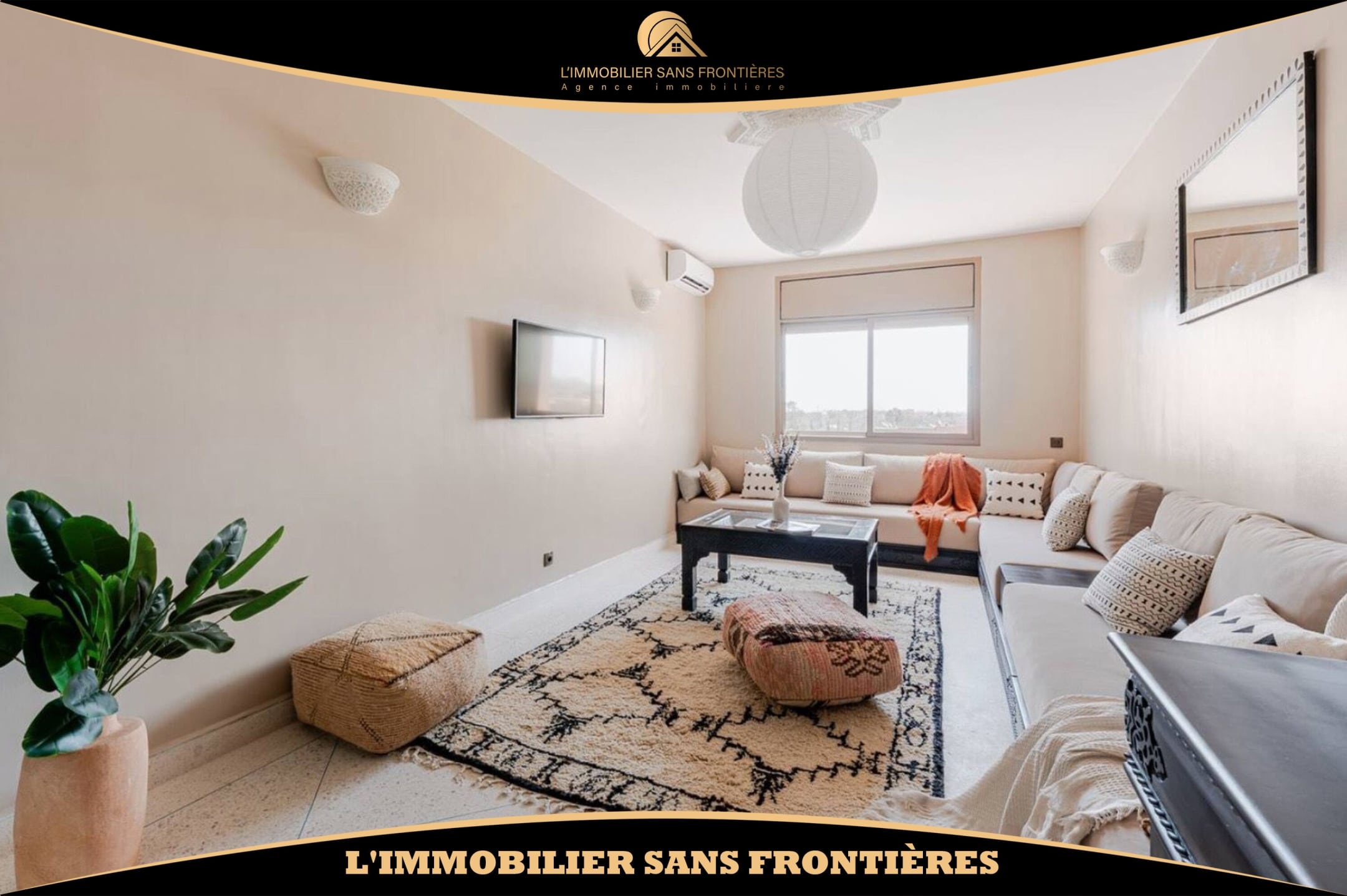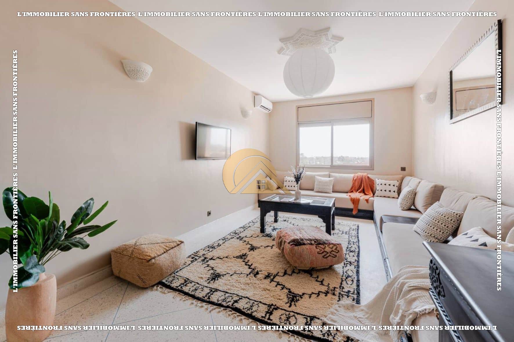 Salon marocain – Séjour – Cuisine équipée – Terrasse – 3 chambres avec placards et climatisation – 2 salles de bain – Terrasse