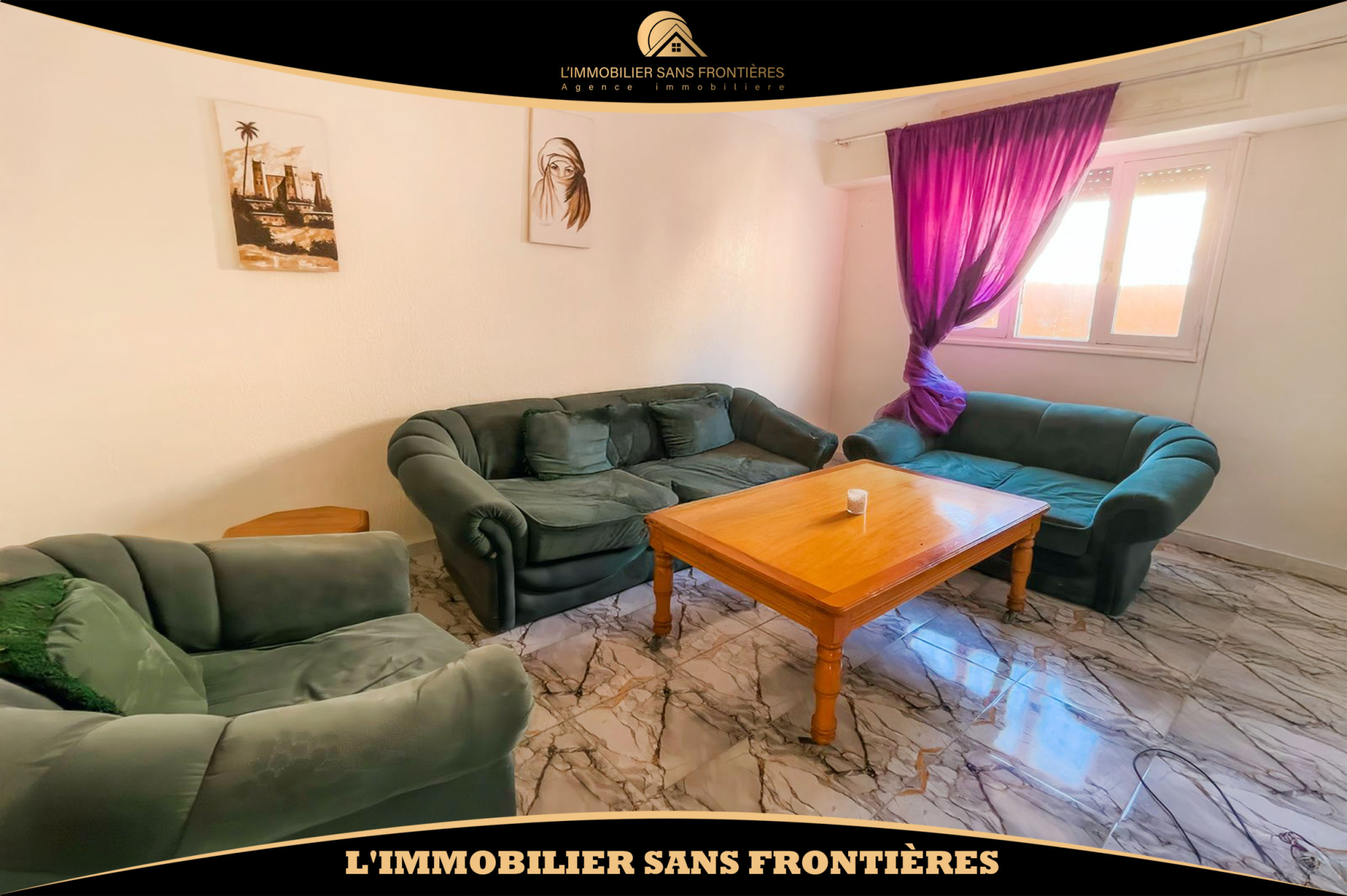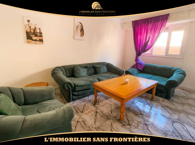 L’Immobilier Sans Frontières vous propose à la location cet appartement meublé de 60 m² situé au 4ème étage à Ain Mezouar, Marrakech. L’immeuble est décrit comme calme et sécurisé. La présence d’une caméra de surveillance et d’un parking au sous-sol est mentionnée.
