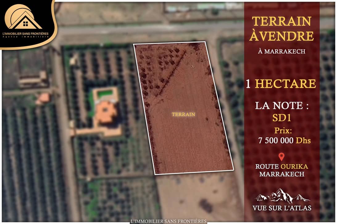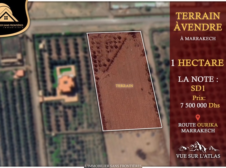 L’Immobilier Sans Frontieres vous propose ce terrain à vendre sur la Route d’Ourika km 14, Marrakech. La superficie annoncée est de 1 hectare (10 000 m²) et le terrain est classifié en zone SD1.