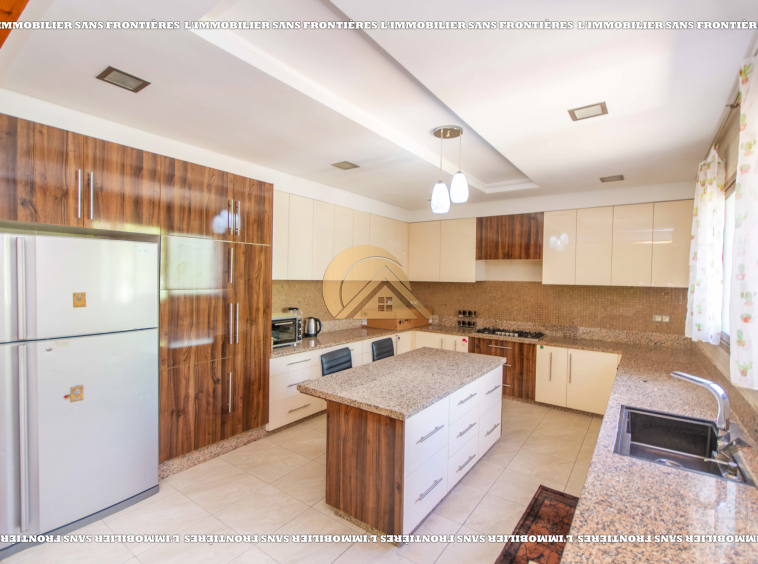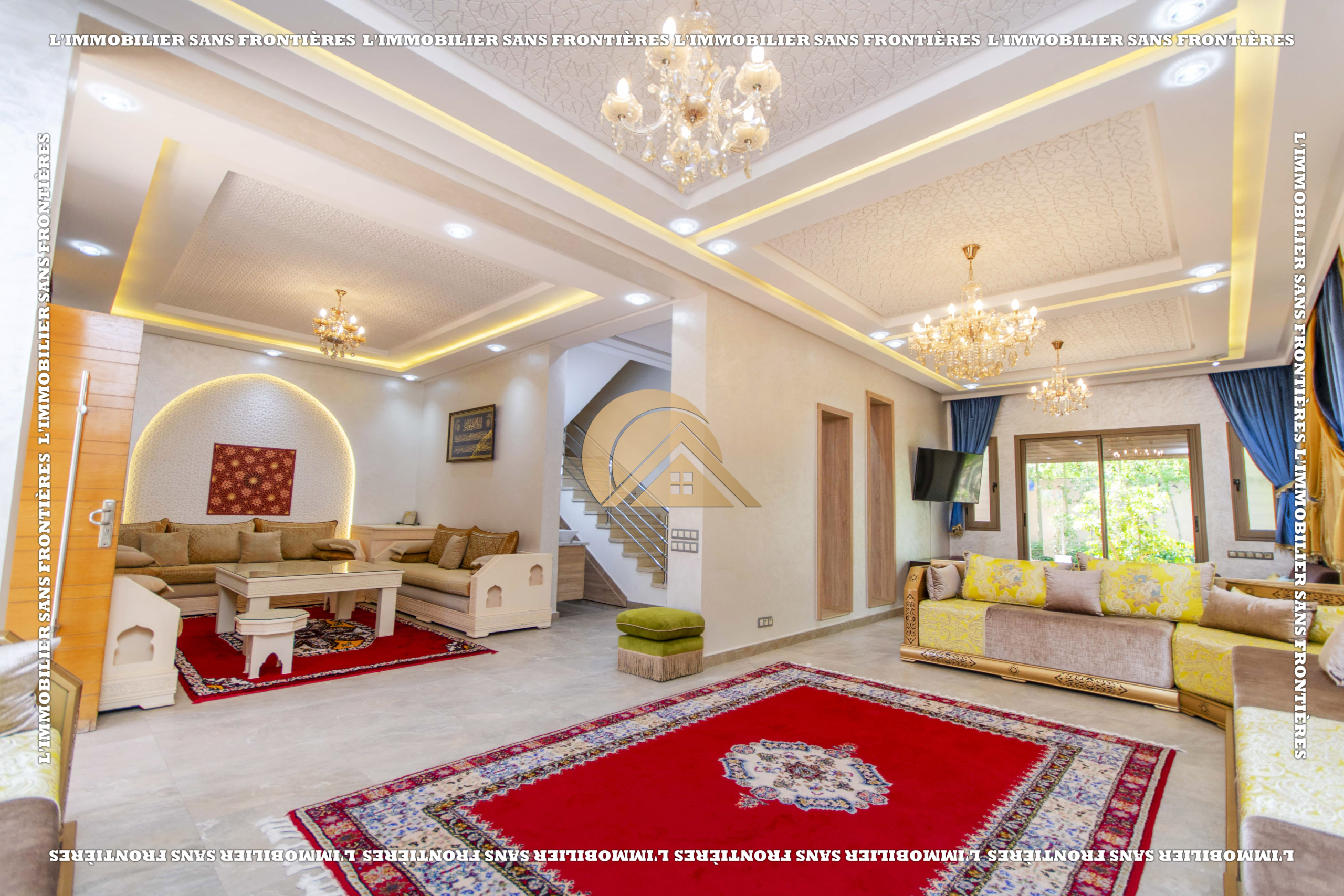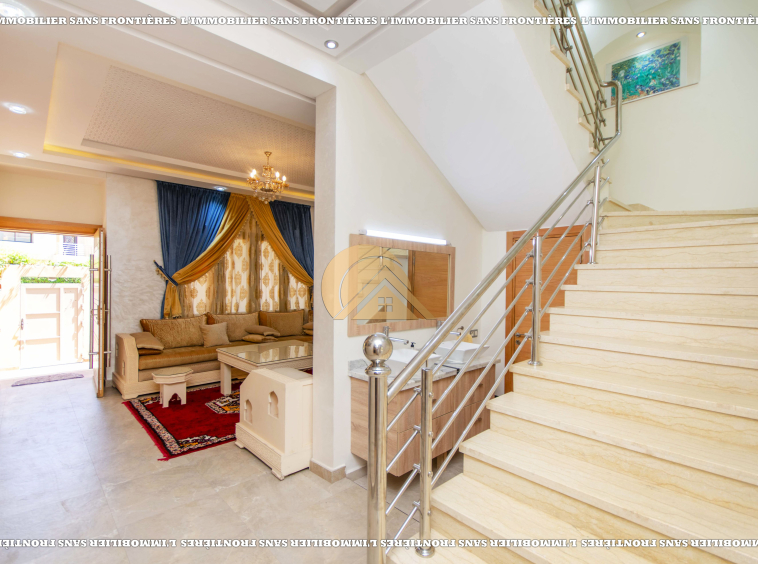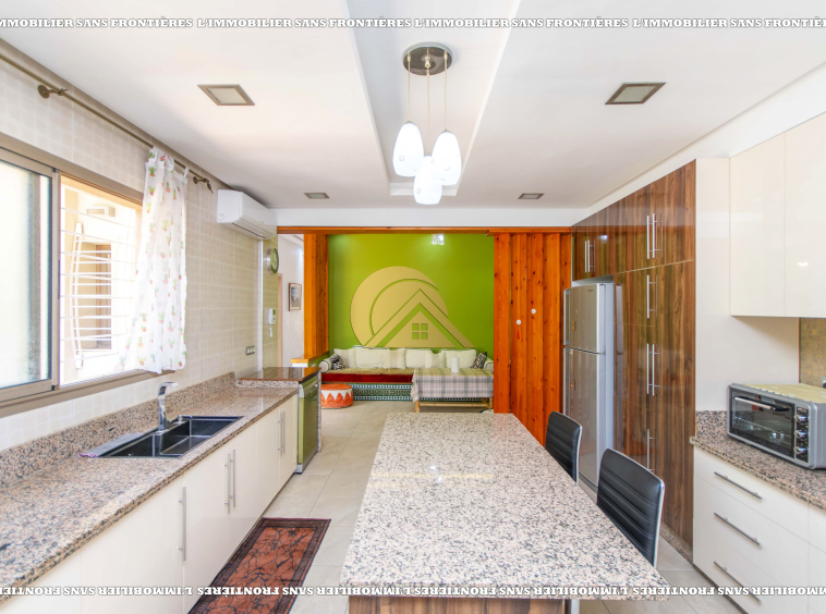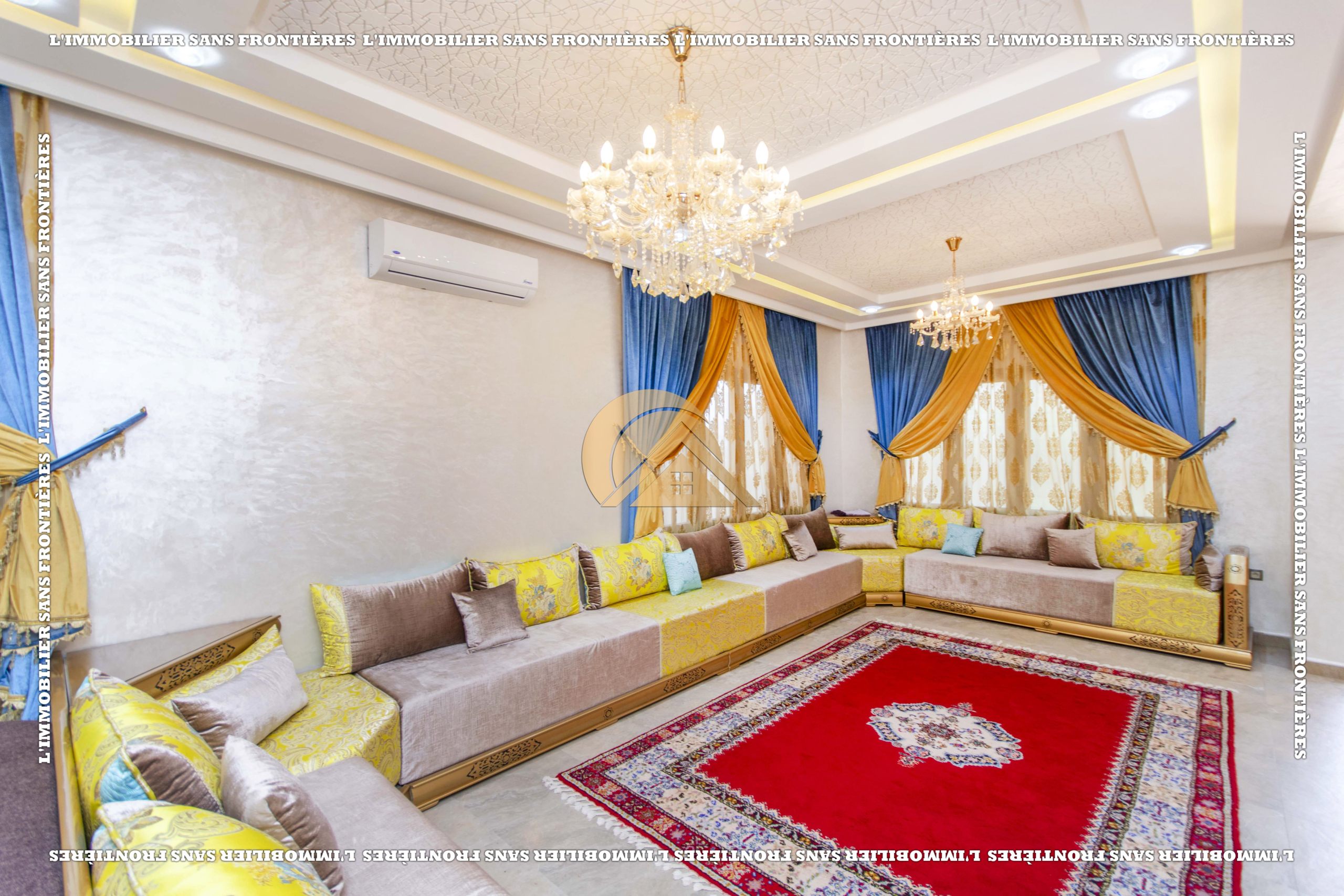 3 salons marocain – Salon européen avec baie vitrée – Séjour – Toilette invité – Terrasse – Cuisine équipée avec climatisation – Buanderie