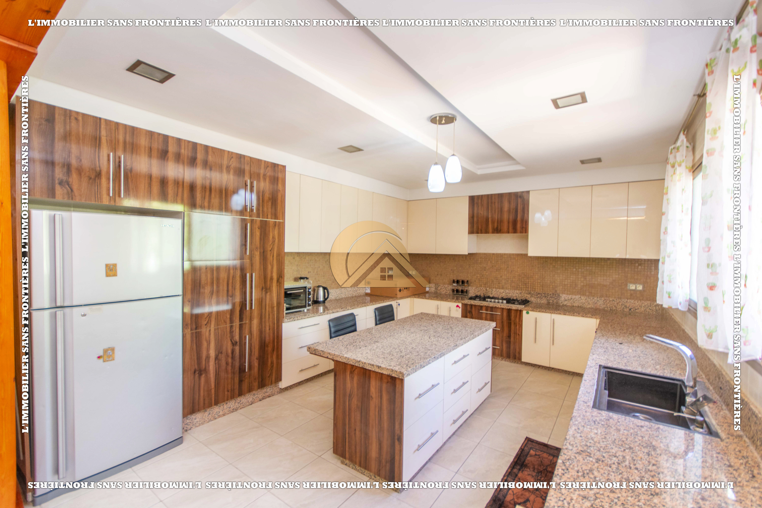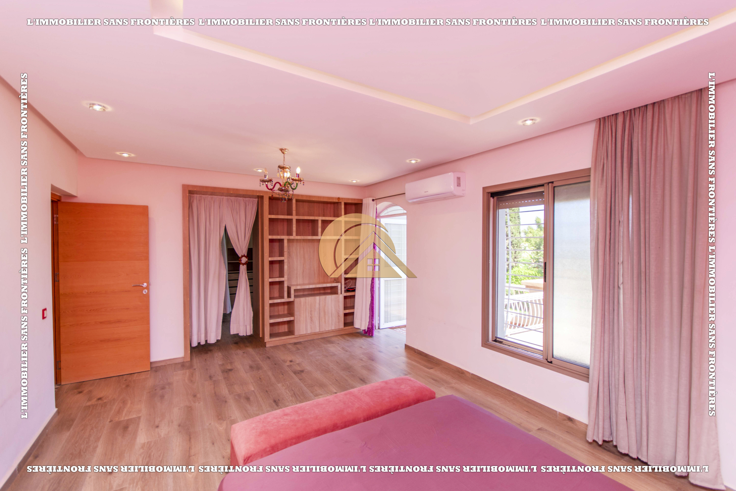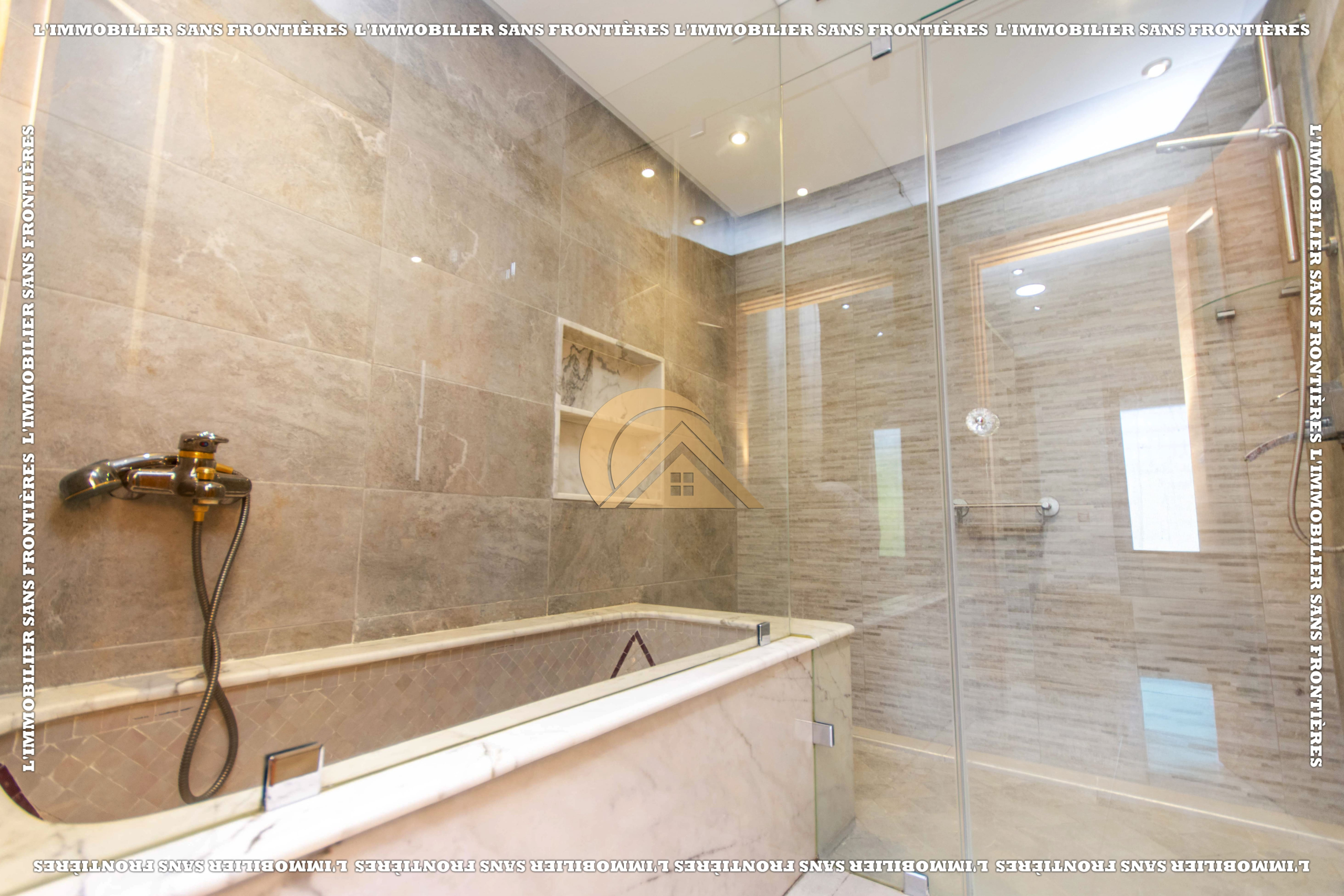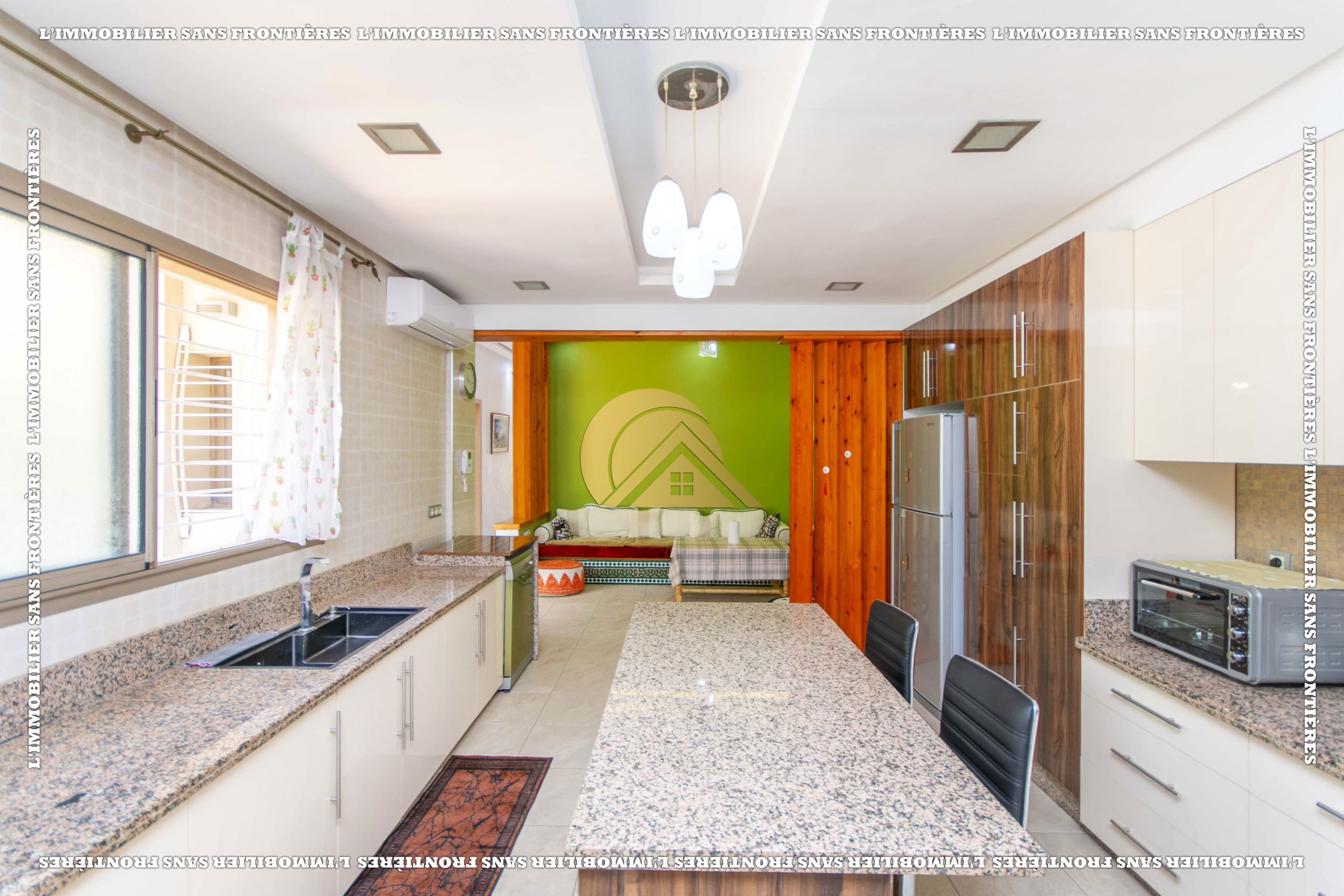 3 salons marocain – Salon européen avec baie vitrée – Séjour – Toilette invité – Terrasse – Cuisine équipée avec climatisation – Buanderie
