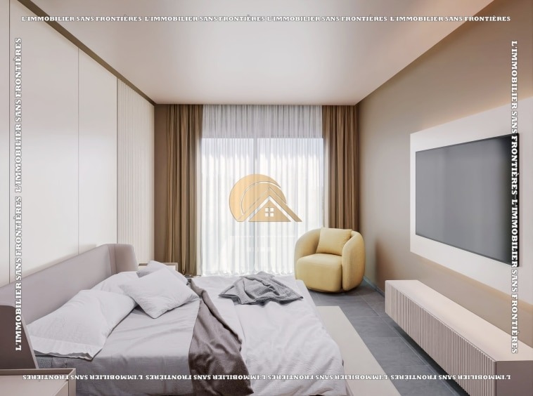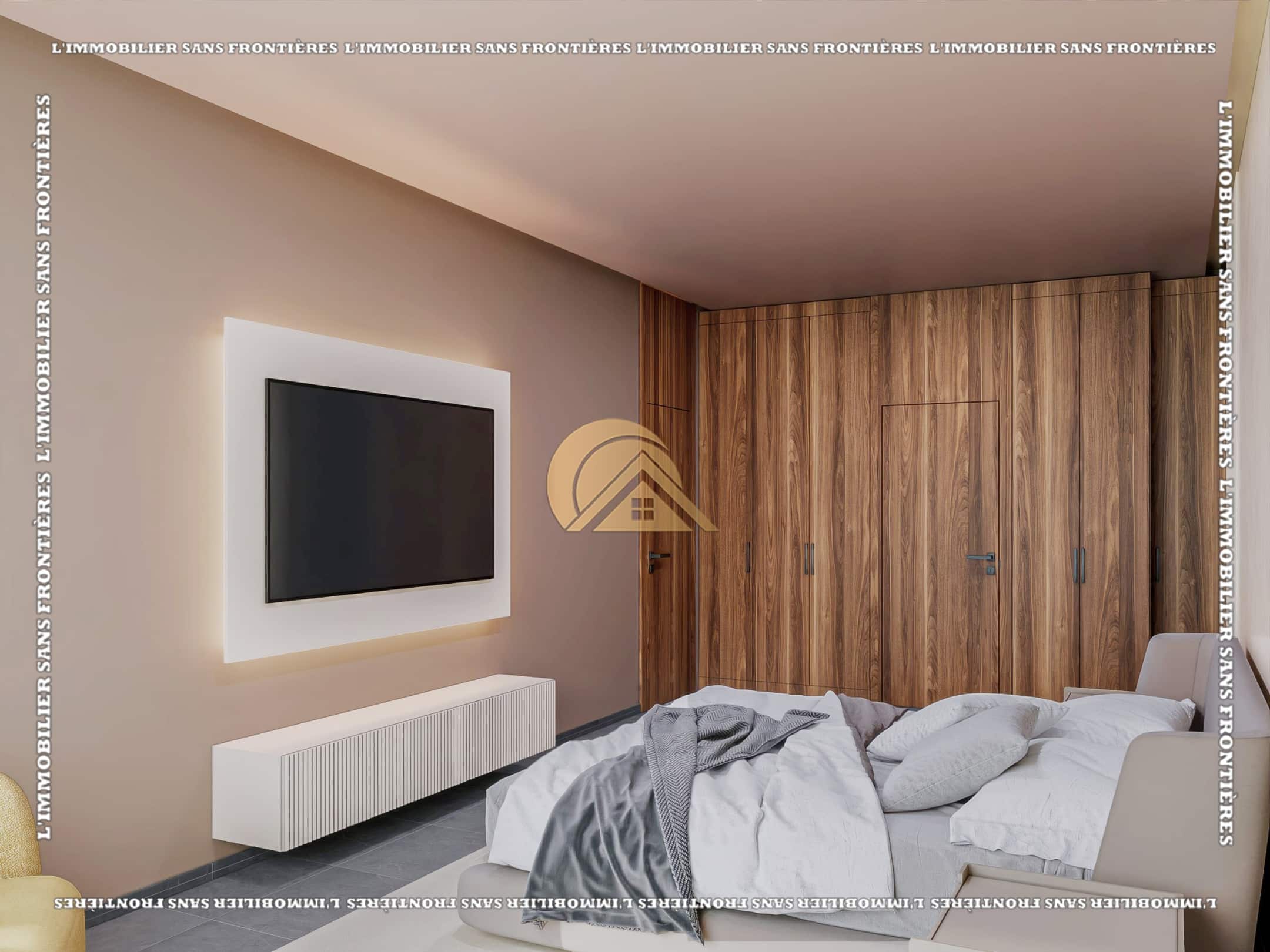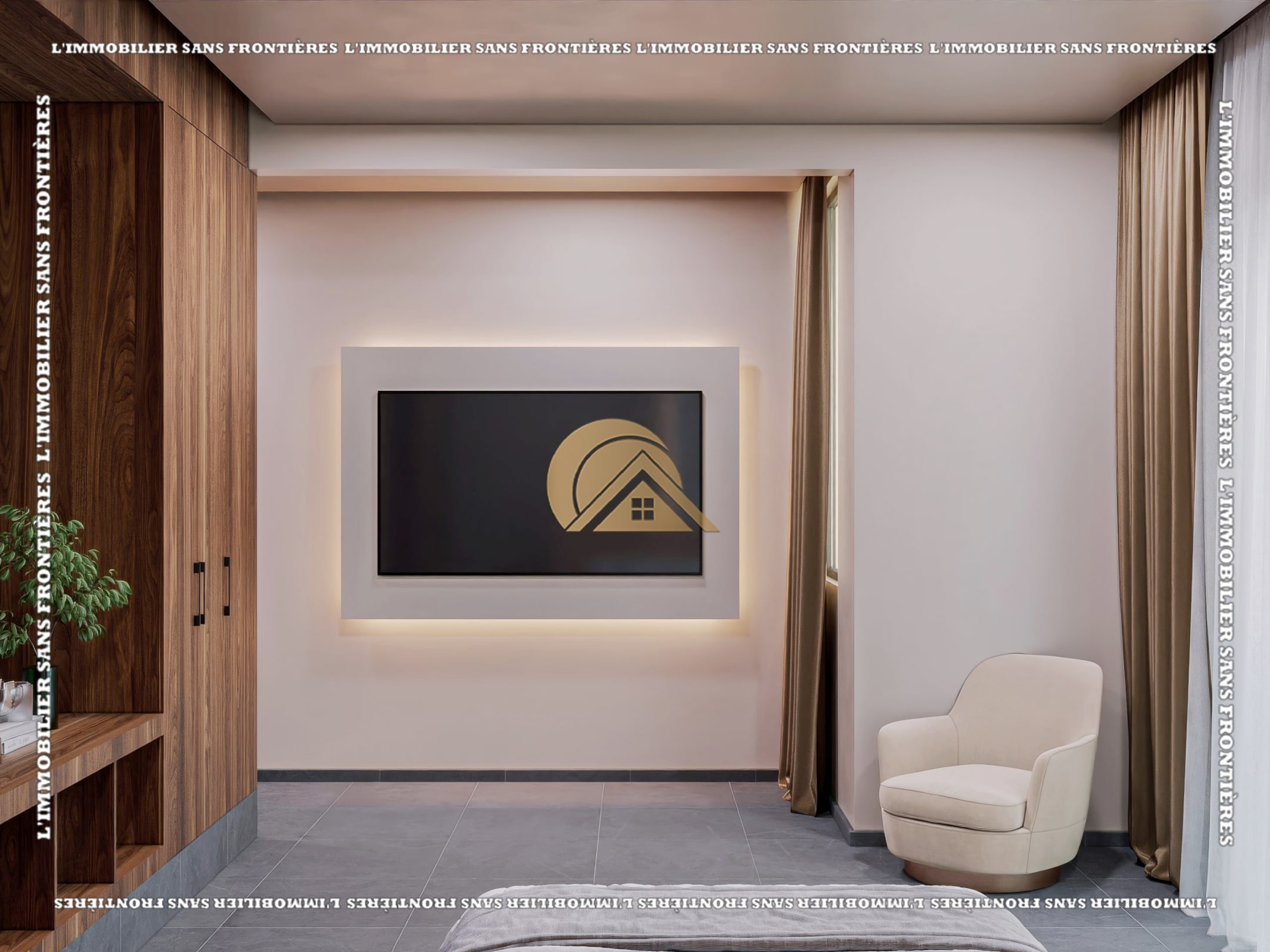 Double Salon européen – Séjour avec climatisation split et baie vitrée – Cuisine équipée – Suite avec dressing et climatisation – Terrasse